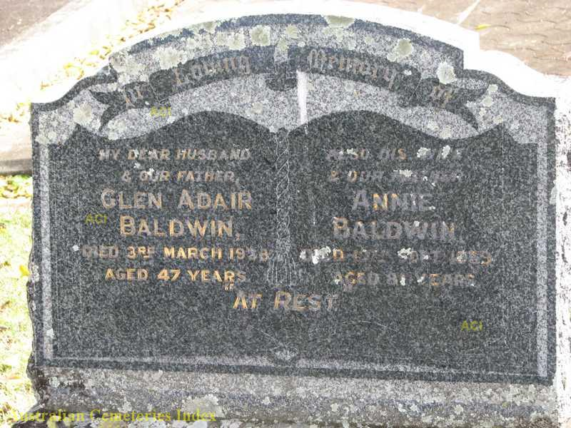 Glen Adair Baldwin was born on 11 September 1889 at Glen Innes, New South Wales, Australia, Birth Certificate #1889, 1889/20927.1 He married Annie Salmond in 1915 at Kempsey, New South Wales, Australia. Glen Adair Baldwin died on 3 March 1938 at Queensland, Australia, at age 48 Death Certificate: 1938, 1938/B38888.1