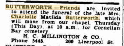 9 Dec 1940. Her married name was Butterworth. She was New Tag 9SG4-5MR. She married Joseph Talbot Butterworth at Unknown. Charlotte Matilda Tatnell was born on 4 January 1887 at Sorell, Tasmania, Australia.1,2 She was the daughter of John Richard White Tatnell and Isabella Bloomfield. Charlotte Matilda Tatnell died on 18 July 1950 at Hobart, Tasmania, Australia, at age 63. She was buried on 20 July 1950 at Cornelian Bay Cemetery, Hobart, Tasmania, Australia.
